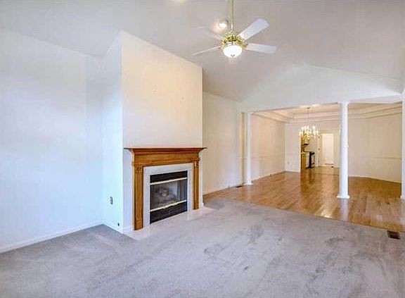 Beautiful low maintenance home featuring Trey ceiling,crown moldings,harwood floors,cathedral ceiling in the living room with fireplace,new carpet in the bedrooms,double bowl sinks in the full bath with a ceramic shower with heated seat.large closet,fully equipped kitchen,open floor plan,storage with pull down stairs in the garage,neutral decor throughout,mudroom laundry area off the the garage,pool and clubhouse.