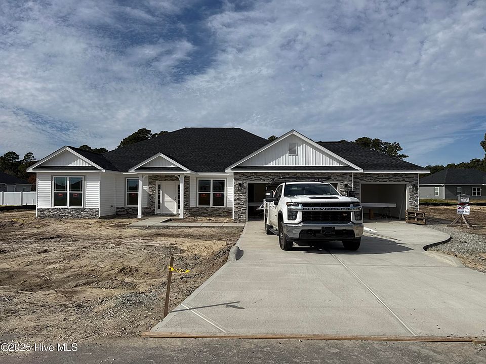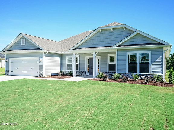 This stunning ranch-style home offers the perfect combination of luxury and functionality with 2239 sq. ft. featuring 4 bedrooms, 2.5 bathrooms, covered porch & patio, 3- CAR GARAGE all situated on large lot. As you step inside, you're greeted by a bright and inviting foyer that seamlessly flows into the formal dining room, beautifully accented with board and batten trim and tray ceilings. The open-concept family room features 9-ft. smooth ceilings, flush-mount lighting, and a cozy gas fireplace, making it the perfect space for gatherings. At the heart of the home, the Chef's Dream Kitchen boasts oversized quartz countertops & island with pendant lighting, upgraded stainless steel appliance package, abundant cabinet space & a walk-in pantry, PLUS access to the covered patio—ideal for entertaining. The primary suite is a true retreat, with tray ceilings, crown molding & a huge walk-in closet. The spa-like bathroom has a walk-in ceramic tile shower, separate soaking tub, cultured marble top with dual sinks & a private water closet. On the opposite side of the home, you'll find three spacious bedrooms all with walk in closets and a full bathroom, providing privacy and convenience for family or guests. Enjoy the benefits of NO CITY TAXES and convenient access to SJAFB, Kinston, New Bern, Hwy 42, and North Carolina's stunning beaches!