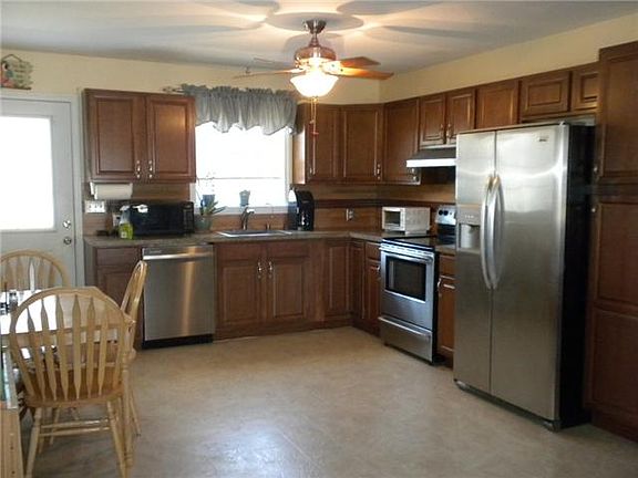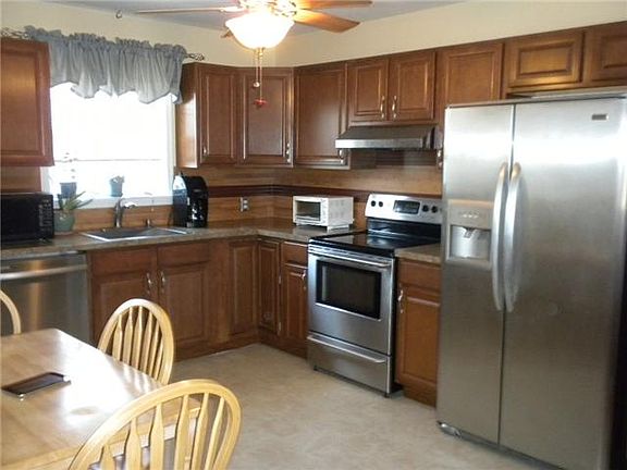 Home has a beautiful eat-in kitchen with all stainless steel appliances, a unique bamboo back splash and a deep farmers sink and maple cabinetry. Off the kitchen is a spacious living room with a wood burning stove. Master bedroom has its own full bathroom with granite counter tops and updated fixtures. All three bedrooms and kitchen have ceiling fans. Laundry room includes front loading washer and dryer, and plenty of shelves for storage. Back patio attached to the house along with a 24x10 shed and a 23x22 detached 2 car garage that's fully insulated, has air conditioning and heat. Beautifully well kept mature landscaping and garden. It will go VA and/or USDA.