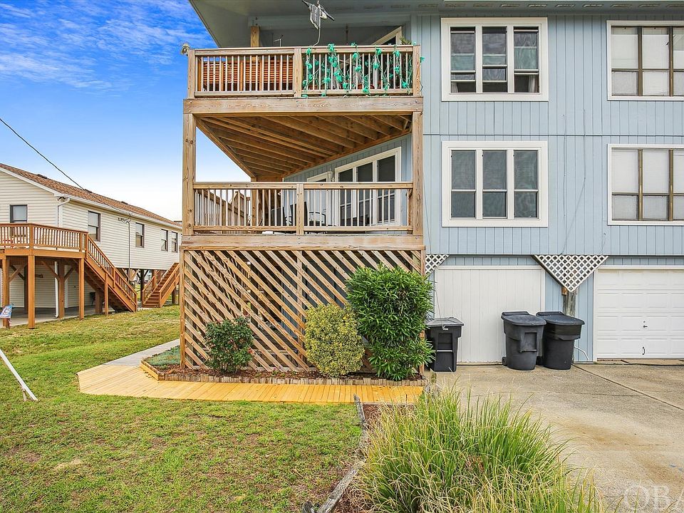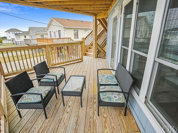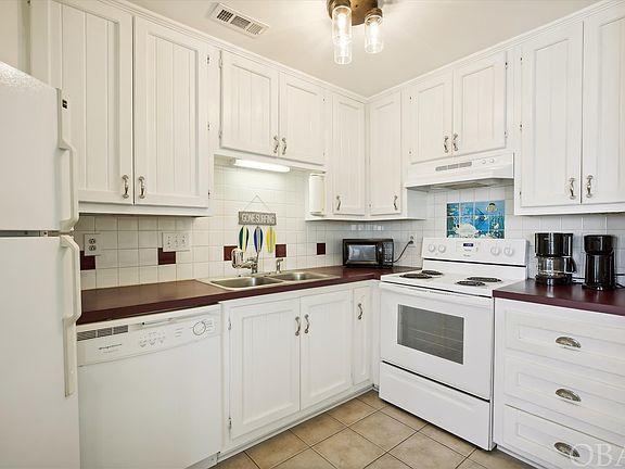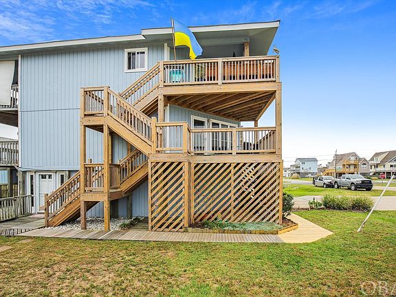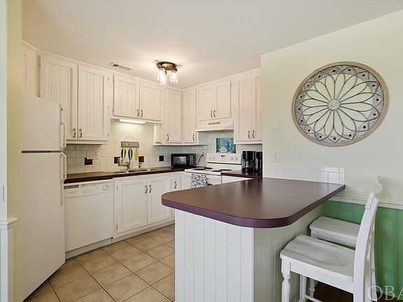 Wonderful light filled condo in prime location across from the Ocean Bay Lifesaving station! Important updates include new HVAC system in 2018, water heater 2021, roof replaced in last 5 years, front deck and stairs replaced in 2021, ocean side decks replaced in 2022. All new Jeld Wen windows replaced in 2021 with upgraded trim. Upon entry, the large front deck is spacious enough for a table and chairs, great for entertaining! The condo is open concept with two sets of triple windows in the living and dining area. Tall, white cabinets and breakfast bar seating in the kitchen. Laminate flooring in the living and dining area, ceramic tile in the kitchen and bathrooms. Home has been professionally painted throughout. Master bedroom features newer luxury vinyl plank flooring, wainscoting, ceiling fan, two closets, and a large en-suite bathroom with separate vanity and two person square jetted tub! Second bedroom is also like a master with direct access to the updated hall bathroom from inside the bedroom. This room has newer carpeting, wainscoting, and a ceiling fan. Both bedrooms have direct sliding glass door access to the second ocean side deck. Laundry, storage unit for condo and outside shower on ground level. Don't miss your opportunity to own this lovely, bright and spacious condo in a great location to enjoy all those wonderful Outer Banks memories!