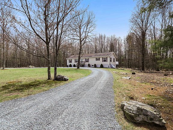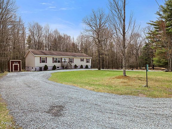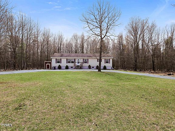 You will feel right at home as you enjoy the peace and serenity that this spacious and well maintained 3 Br 2 Bath home on 3 + acres on a quiet Cul-de-sac has to offer. Seamless Fam Room/Den - Kitchen - Dining Rm -Living Rm on main level for entertaining or relaxing. Primary BR with Bath Suite and 2 additional Bedrooms and another Full Bath on the main level. Basement has a pellet stove and is framed and ready to be finished. Shed has electricity. Built in 2000. Trex 24 X 16 deck in back. Minutes from Lake Wallenpaupack! This house is a must see and will not last!