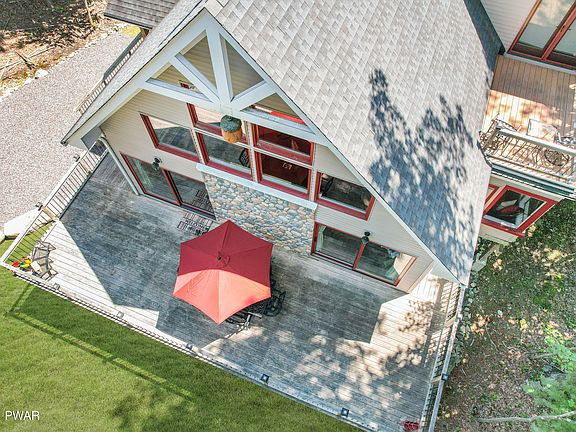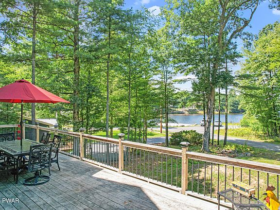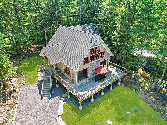 LUXURIOUS CUSTOM BUILT CHALET WITH LAKE VIEWS! Located just 90 minutes to NYC, find this 2700 SQFT property that has been dubbed the best bed and breakfast in town by family & friends of the seller! Just steps from the lake, this property provides that Pocono charm with log posts, a cathedral wooden ceiling & wood walls, custom hickory cabinets, a cozy wood burning stove, & a stunning granite island w/ whimsical hand-carved bears at each end. Hardwood floors throughout, an 8'' poured concrete footing & foundation with rebar, 2x6 construction, Marvin windows/doors, Azek fascia, LED lighting, Wifi thermostats, solid wood doors, Ring security cameras, & a lower level WAVE system, are just some of the great selling features. Four bedrooms, 3 bathrooms! 3 season room! 2 new Wifi A/C units!