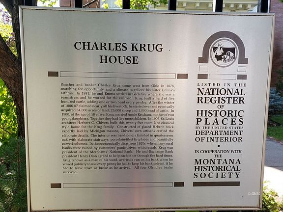 The Historic Krug Mansion, also known as Charley Montana, is listed in the National Register of Historic Places. This stunning 11 bedroom, 8 bathroom Mansion has been left in its original beauty with led glass windows, Quarter sawn Oak floors, trim, pocket doors, wood burning fireplaces and 12' ceilings & many other charms of its Era, while also being carefully maintained to preserve its authentic self, but also updated to meet current times/demands! This property is perfect for many kinds of businesses! It was used as a successful Bed and Breakfast for many years, but is currently an Airbnb, that has worldwide access to renting from the internet. The house is a short 5 minute drive off I-94 & is a lovely alternative to local hotels. Weddings, parties, meetings, & gatherings have been hosted on the property and the impressive landscaping and Wrought Iron fencing is perfect for outdoor events and photos. The property could also be excellent for boutique retail or luxurious office space (attorney, medical, government, etc.). This property is ready to move your home or business to the next level. You WANT to consider this piece of Glendive History to be apart of your life.