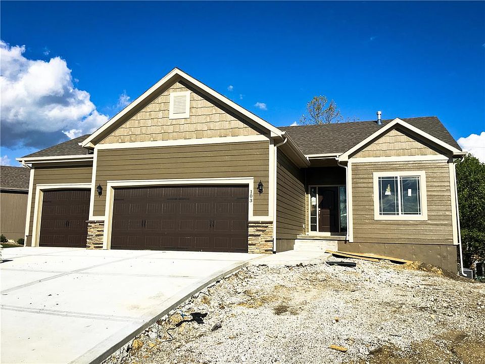 The Clayton by award winning Summit Custom Homes. Beautiful 4 bdrm, 3 ba reverse-ranch on Walk-Out Home-site. Open concept living with spacious great room and dining area. Master and guest bdrm on main level, huge rec room & 2 more bdrms downstairs. Granite tops throughout, s/s appliances & HDMI installed above gas f/p. Stunning master suite walk-in shower with decorative tile walls. His/hers sinks, huge walk-in closet. Main level laundry and more! *Pictures Shown are for reference only 99% Completed! Eagle Glen community in the award winning Raymore Peculiar school district. Exciting amenities such as treed walking trails, huge pool with cabana bathrooms, separate splash pool for kids. At location; quick Hwy 58 & 71 access, minutes away from Raymore's newest shopping, dining and entertainment.