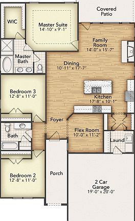 From cooking to dining to relaxing by the fire, this continuous design lends itself to entertaining for all occasions. As you walk through the foyer, to the left, the second and third bedrooms are perfectly situated for a private guest getaway. On the right, utilize the flex room for a home office, craft room or play area for young kids. This unique space offers the chance to customize your home to fit the needs of your family. Continuing through to the open kitchen, the extended countertops and island are the ideal workspace for anything from a simple family dinner to a culinary masterpiece. A walk-in pantry with two walls of storage means maximum space for all your snacks and ingredients. Situated in the back corner, the owner's suite is the epitome of space and comfort. With a door right off the family room, this bedroom gives you a lot of natural light and easy access to the outdoor covered patio. A double-sink vanity means you'll never have to share space again. Complete with a stand-up shower, tub, and walk-in closet, this space has all the amenities for ideal living.