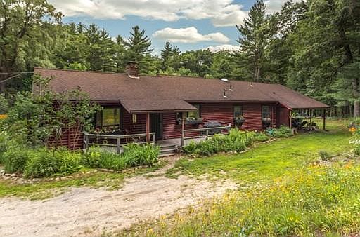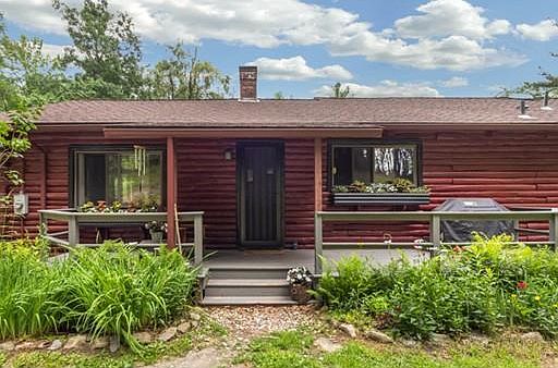 Remarkable Ward Cedar Log Home nestled in a nature lover's setting ...overlooking a pond and surrounded by perennial gardens, blueberry bushes, and fruit trees. The perfect one level living in this ranch style floor plan includes finished area in the lower level of 454 square feet. South facing front porch faces the pond. Enter a foyer/ office area, adjoining the great room and kitchen. A front to back fireplaced Great Room has a cathedral log ceiling and dining area on the back side to adjoin the kitchen. Plenty of light and charm. The oversized kitchen is on the north side of the home and opens to a back porch. The light oak kitchen includes a moveable island and recent appliances. The bedroom wing has three large rooms (2 bedrooms and an office) plus a master bedroom added to the home at a later date. Hardwood floors throughout most of the upper level with exception of kitchen and baths. The sunny master suite boasts a private bath with tiled shower, +deck with pond views!