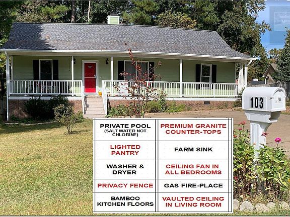 In Carrington Woods. NO HOA. One Mile to Knightdale Blvd. Two miles to Knightdale Station, Home is all electric. Home is in low traffic Cul De Sac with plenty of parking available. Covered Front Porch. BACKYARD has Privacy Fence and Pool - LIVING ROOM has Vaulted Ceiling, Ceiling Fan, Gas Fireplace - MODERN KITCHEN has upgraded cabinets on all four walls; Lights attached to cabinets provide lighting for the Premium Granite Countertops - Durable BAMBOO FLOORS are gorgeous and rugged; REFRIGERATOR has Ice, Cold Water and Door-In-Door for quick access to drinks, PANTRY light turns on when pantry door is opened; Pantry light turns off when door is closed; MICROWAVE above oven; OVEN has adjustable Coils big enough for that big, oversized pot, Dishwasher. Most applicances purchased 8 years or less. Farm Sink - Floor to Ceiling BOOK SHELVES for family pics, cook books and cherished items. WASHER & DRYER included. - CEILING FANS in all bedrooms and Living Room. PRIMARY BEDROOM has walk in closet, private bathroom, ceiling fan. BEDROOM 2 has ceilling fan. Closet was remodeled to add double rods, shelving and wide doors for full and easy access. BEDROOM 3 has Ceiling Fan. Closet was remodeled to have double rods, shelving for storage and wide doors for full and easy access. Hot water heater is new in May 2024. City Water. City Sewer.