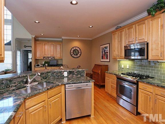Southern Village townhouse*Brick front*3 bedroom, 21/2 bathrooms*Master bedroom on main floor*Hardwood floors*Remolded kitchen w/ stainless appliances, unique riverstone granite countertops w/ glass subway tile backsplash*2 story family room w/ wall of windows,gas fireplace flanked by built-in bookcases*Wonderful private patio area*2 car garage*walk to pool & tennis courts,walking trails,restaurants, shops, grocery, movie theater,& seasonal events on the green. Washer,Dryer, & Refrigerator convey