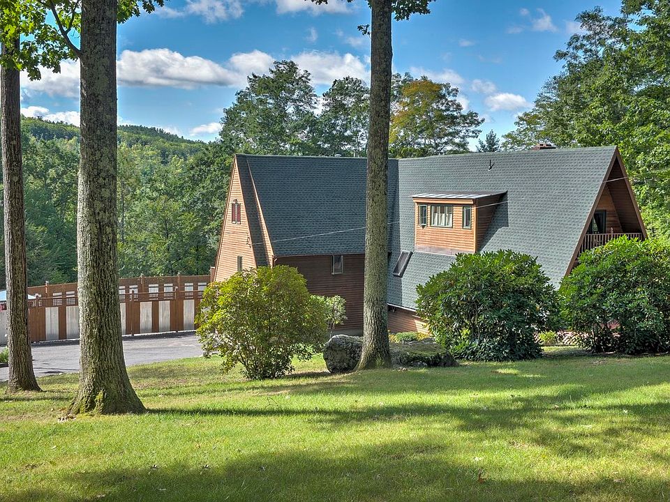 The BEST of both worlds.. a country setting with a very short drive to Keene! Enjoy this immaculate 3/4 Bed, 3 Bath A-Frame with thoughtfully designed landscape.. complete with pool and cabana area for you to convert to an outdoor kitchen in the summer. (Electric and utility sink). Pride of ownership shines on this one! Seasonal view of Mt. Monadnock during Fall/Winter. 1st Floor has primary en suite with radiant heat in the bathroom, walk in tiled shower, and laundry. Deck that overlooks the back which is ideal for star gazing. 1st floor also includes, sunroom, Family room with vaulted ceiling, magnificent field stone fireplace with pellet stove insert and Acacia hardwood floors. Kitchen is efficient and comes with SS appliances. and a close by office space. There is also a front living room with fireplace and a child's "secret room". Wander upstairs to 2 additional bedrooms.. one generous in size. There is a craft room with ample built ins or would make a nice home office, a 3/4 bath completes the 2nd level. The walk out lower level has partially finished game room and seating. Additional features and amenities include; Decks, hot tub hook up, stamped concrete patio around pool, fire pit area, plenty of parking for your RV vehicles. All lighting is LED, programmable thermostats, 8 x 12 shed, trikeenan & brick house tile.. This is a fabulous home to raise kids.. let them explore the 2.96 acres.. and enjoy the wonders of the outdoors! Fiber optic available.