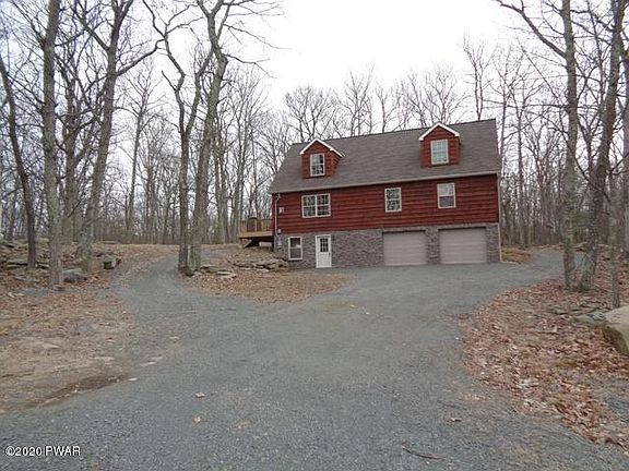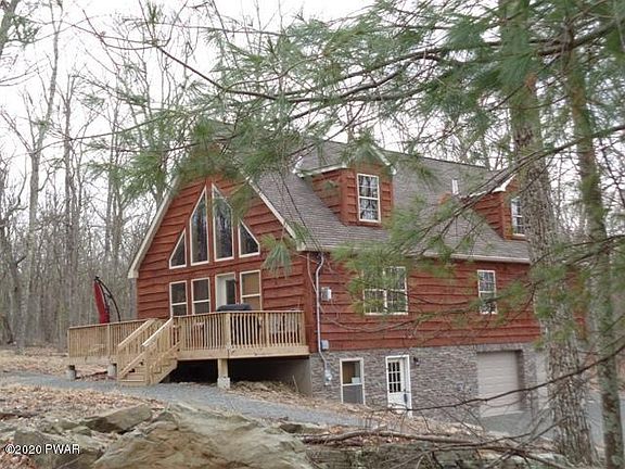 This one's a WINNER! Adirondack wood and stone Chalet. 4 bdrm, 2 master suites, 4 bath, open concept design, vaulted ceilings, lots of light. Oak floors, fireplace, walk out finished LL w/ entertainment room & bar area. Large 2 car heated garage w/storage/workshop area. Deck. Circular driveway around house. Lots of parking. Top of the line 50 year roof, guarantee for buyer. Generator. Beautiful stone work. Located in one of Pennsylvania's most popular communities, inclusive of ski resort, motor boating lake w/ beach, picnic area on the Delaware River, horseback riding, 4 wheeling trails, swimming pool and much more! Low taxes. Commutable distance to NYC and other metro areas. See our new virtual tour!