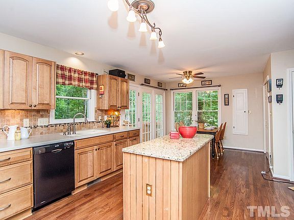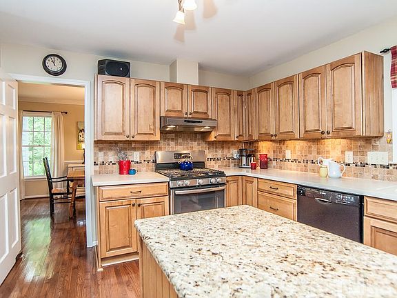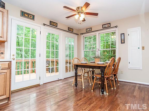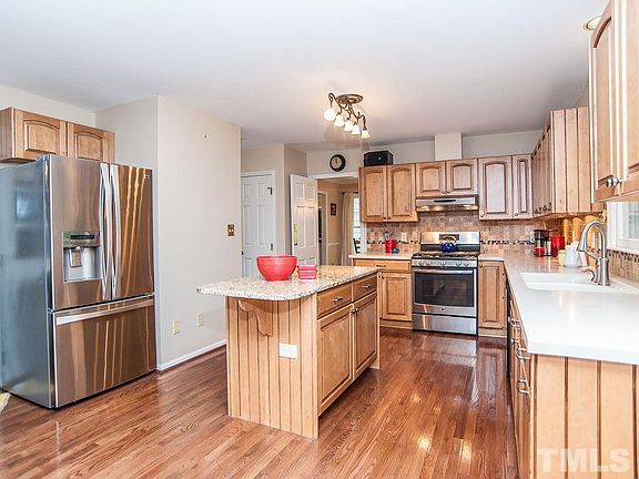 Warm and Inviting Home in Cary with 4 bedrooms/ 2.5 baths on a cul-de-sac lot. Features: stainless steel appliances, solid surface countertops, gas range, granite island, tile backsplash, cheerful nook, lighted ceiling fans, cathedral ceilings, arched doorways, wood burning fireplace, crown molding, chair rail, hardwoods, carpet and tile. Master with his and her closet, bath:with soaker tub and separate shower. Enjoy sitting on deck over seeing private wooded yard, stone patio, landscaped. Must See!