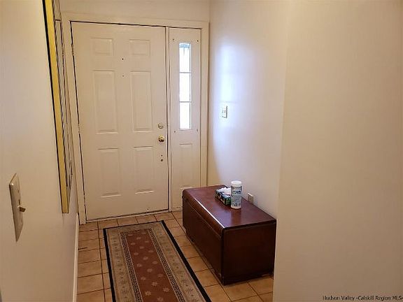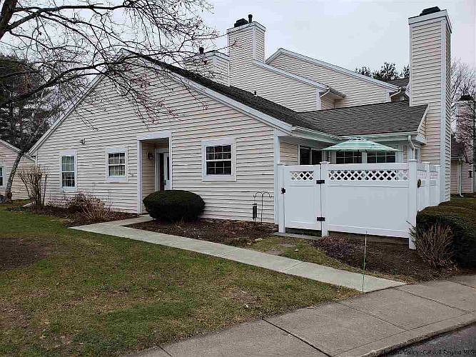 One of the only Ranch Townhome Condos in Ulster County. This 2 bedroom 2 bath home has open floor plan with dining room area and large livingroom. The fireplace has a georgeous wood mantel and the grasscloth is a focal point which only adds to the ambiance. On each side of the fireplace are windowed sitting nooks. Eat in kitchen with pergo type flooring(appearing like wood) has plenty of cabinets and sliders to a private fenced patio. The 2 bedrooms are good size and the master has a full master bath. Extra storage in the pulldown attic space. Priced well in today's market. HOA fees are only $333.24 and include trash, water, lawn care and snow removal