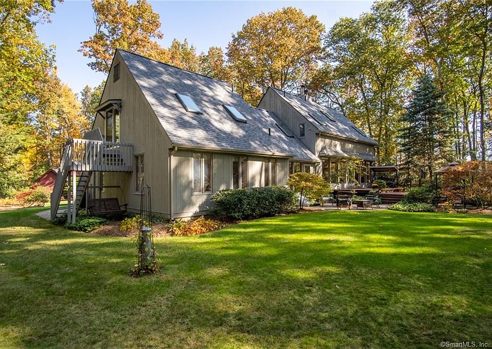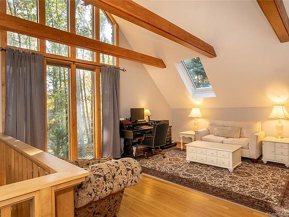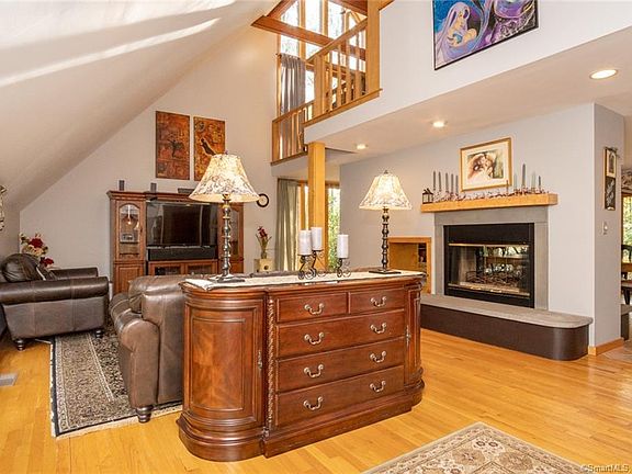 This home is quinessential Granby. Privately set back on a curvilinear asphalt drive with majestic oak trees and exquisite specimen trees. Ideally located less than 2 miles from the the busy center with lots of eateries and every other need you could desire. The double entry doors features Baldwin Brass entry hardware, an entry foyer and hall with multiple sliding barn doors opening up to the main Living, Dining and Kitchen areas. A huge wall of glass and sliding doors lead to a spectacular deck, grill area and patio with a new propane firepit. The Breakfast Room and Living Room share a two-sided masonary fireplace. The Kitchen offers an island with double sink, newer Stainless appliances, granite counters and a snack bar. The is excellent contemporary lighting throughout this space. The Living Room/Dining Room share a wide open two-story space with soaring celings and spectacular windows. The second-story includes a Loft that is open to below with lots of bright open space which currently serves as a study. There is also a guest bedroom and full bath with skylight just down the hall. The entry level has another full bath, laundry room and a bedroom with a smaller tandem bedroom or nursery. The rear hll leads to the garage and also an open staircase leading to the Master Suite. This very large room has a beautiful master bathroom with spectaculer tiled shower and a jet-tub with skylight. There is a balcony and stairs to the rear yard from the Master Bedroom.