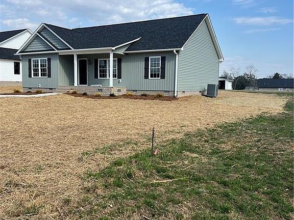 BEAUTIFUL NEW HOME! Home features 3 bedrooms 2 full bath on this single story home. Vaulted ceiling in kitchen and Living Room with open concept. Kitchen features lower cabinetry and upper cabinetries two toned beautiful contrast. Pantry, laundry room combo is so spacious and tucked away.Huge primary bedroom with large walk in closet and ensuite with double vanity. concrete patio makes for great afternoon relaxing. Agent is related to sellers. NCDOT has plans for adding a roundabout nearby and other road work. Please ask agent for website link.