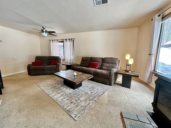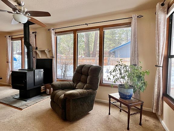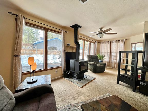 POPULAR - PLEASING and PRIVATE on POPLAR VALLEY ROAD! This lovely home has all the right boxes checked. The home sits back on the lot with a spacious Trex (type) deck in the front and beautiful lawn to the street that enjoys a view of the Plumas Pines Golf Course. Interior has been freshly painted and good flow floor plan. The kitchen with ALL stainless appliances is front and center to the home and also shares counter space for eating in (barstools included!); Master Suite has a fun wooden decorative wall ---- and check out the Master Bath - Tile floors & counters, large jetted tub and separate shower with lots of light! Second bedroom is spacious and has bath attached or can be shared by guests. Utility with washer dryer (remains) ---- step out back and enjoy the flagstone walkway and fully enclosed HUGE rear yard! The detached garage has lots of built in storage (a 2nd fridge to remain) as well as another storage unit behind. This home is made for full time occupants - OR- a great income rental - or just your part time Getaway! 3 heat sources: Woodstove; Toyo stove and forced air furnace! AND -- best of all..... it is sold FULLY FURNISHED! Just pack up the kids and groceries and move on in! Just a short walk away to Plumas Pines Golf Course , and of course all the other FUN Graeagle has to offer: Lakes Basin Recreation area; Mountain Biking; Fishing; Boating, Golf and so much more. Please call for an appointment. This home is occupied.