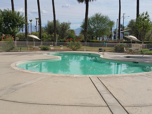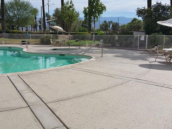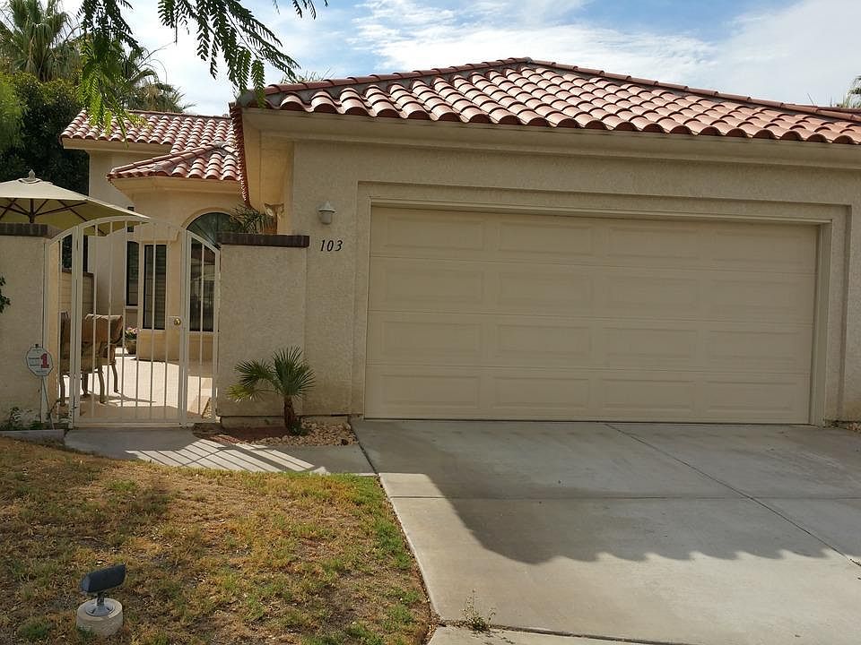 SHORT SALE! At the Courtyards in Desert Falls Country Club! beautiful 2 bedroom 2 bath w/ a fire place in living room. Plantation Shutters throughout, Very airy and bright; feels like a private home, only one common wall to next door unit; new ceramic tile throughout; granite counter tops in Master bath and kitchen, lovely hardwood floor in kitchen and breakfast area; fenced private front patio with built in gas BBQ: walking distance to the pool and Clubhouse.Easy to show, owner very motivated, AT THIS PRICE IT WONT LAST.