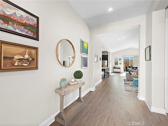 Enjoy this stunning Arista 55+ Chateau model home situated at the end of a quiet cul-de-sac home with numerous upgrades including waterproof laminate flooring, upgraded carpeting and an extra large wrap around backyard. This masterfully designed open floorplan impresses from the moment you open the door to the cathedral ceilings overflowing with natural light that flows to the oversized great room with sliding doors leading you to the finished sunroom for seamless indoor-outdoor living. Elegant kitchen boasts dark espresso cabinetry with many custom pullout drawers, 36" Chef's style gas cooktop, chimney style stainless hood, double ovens, a large farm sink and beautiful marble look quartz countertops and backsplash. A cafe dining room is spacious and has another set of sliding doors that leads to the entertainer's backyard. The primary suite is a private oasis and features upgraded plush carpeting, recessed lighting, designer ceiling fan, an extra large walk in closet and spa like ensuite bathroom with frameless glass shower enclosure and a dual sink vanity with quartz countertops. The guest suite is complete with upgraded carpeting, a designer ceiling fan and ensuite bathroom with tub/shower combo. Additionally there is a den tucked in the back of the home that is wonderful as an office or extra space to entertain. The backyard is private and features zen desert landscaping with decomposed granite and large paver stones, planter boxes for gardening and a peaceful trickling fountain. Welcome to the best 55+ living with access to all of the RMV amenities for all ages plus exclusive access to the Gavilan amenities including pools, gyms, bocce, firepits and more.