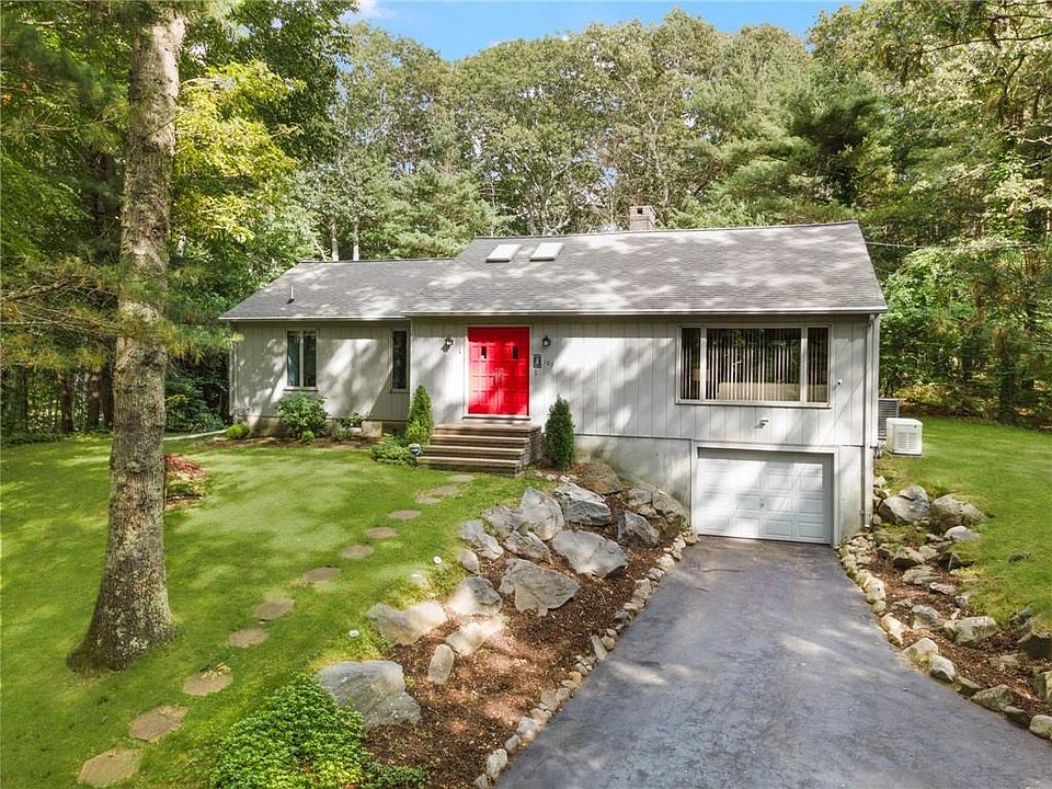 Nestled on an acre in the highly sought-after Heritage Hills neighborhood of North Kingstown, this custom-built California contemporary home is a rare find. Offering 3 bedrooms and 2 full bathrooms, this home blends charm and comfort. A stunning double-door entry leads to a main level with vaulted ceilings and exposed beams, anchored by a grand stone gas fireplace that separates the dining/living area from the open concept kitchen and family room. Whether you're entertaining or enjoying a quiet evening, the layout offers space and flexibility. The primary bedroom features a private balcony overlooking the wooded backyard. A second bedroom and full bath with double vanity complete the main floor. Downstairs, discover a fully finished walkout lower level that includes a large living room with a fireplace and slider out to the backyard, a full bath with laundry and third bedroom. Outside enjoy peace and serenity in your private wooded yard. This home has all of the amenities- central air, public water, gas heat/cooking and on demand hot water, whole house generator, 200 amp electrical service, 4 bedroom IDX septic. Convenient to restaurants, Wickford Village, South County Beaches and the Wickford Junction MBTA commuter rail station.