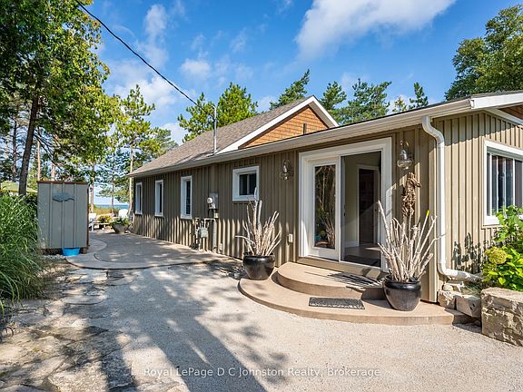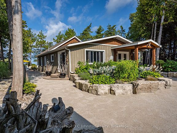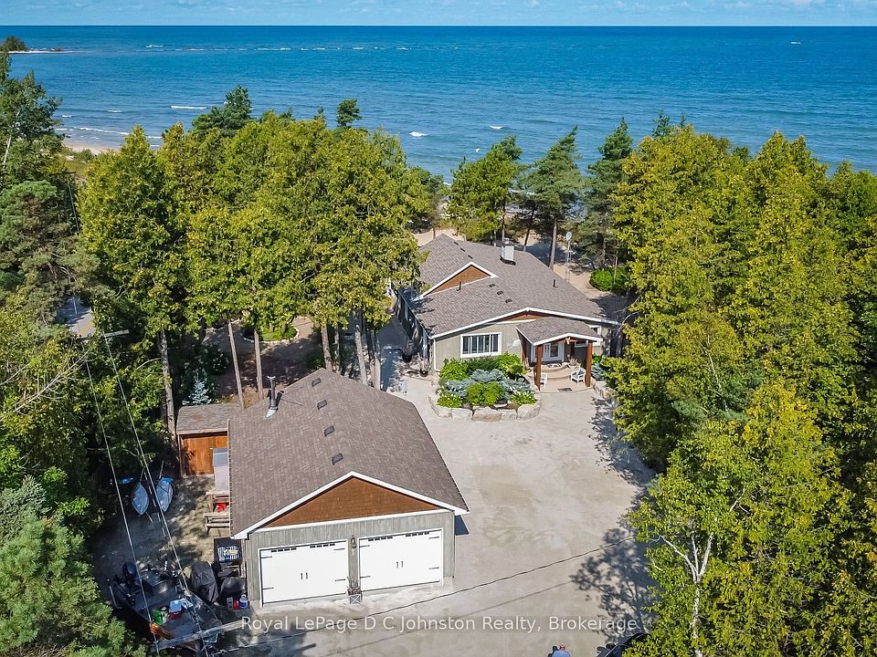 Dream Beachfront Retreat in Port Elgin. This is an unparalleled opportunity to own a piece of Saugeen Beach Road's coveted shoreline, nestled in the trees along the enclave known locally as Eidt's Grove. This property boasts a generous 111 foot frontage of sandy Lake Huron shoreline, offering spectacular panoramic views and sunsets. The large, private lot is a natural oasis, featuring a charming babbling stream that meanders through the property. The fully renovated 1,800 square foot year-round home or vacation hideaway (fully updated in 2010) is designed for comfort and style. Inside, the home is anchored by a rustic stone fireplace in the main living area, complemented by engineered hickory wood floors and a bright, functional kitchen featuring whitewashed poplar cabinetry, a large island, and stainless steel appliances. With three bedrooms, a large entrance foyer, and a main-floor laundry room, this home is as practical as it is beautiful. Step outside to exceptional outdoor living spaces, including stunning exposed aggregate concrete walkways and patios that lead directly to the white sand beach. The property is complete with an oversized, detached 24 x 30 foot insulated garage/workshop, a woodshed, a 7 x 11 foot bunkie, and a refreshing outdoor shower, making this a truly turn-key lakefront gem.