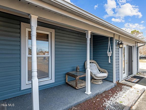 Charming 3-bedroom, 2-bathroom home is nestled on a generous .41-acre lot and offers a perfect blend of comfort and style. As you arrive, you'll be greeted by a paved driveway leading to a cozy front porch—an ideal spot to relax and enjoy the peaceful neighborhood. Step inside to discover an inviting open floor plan with beautiful LVP flooring that flows seamlessly throughout the living space. The heart of the home features a warm and welcoming wood-burning fireplace, perfectly accented by exposed beams and pillars that elegantly separate the living and dining areas. The eat-in kitchen boasts sleek granite countertops, stainless steel appliances, and plenty of space for family gatherings or casual meals. Just off the kitchen, a spacious walk-in laundry room adds convenience to your daily routine. The primary bedroom is a true retreat, complete with a stunning en suite bathroom featuring a tiled walk-in shower with dual shower heads for a spa-like experience. Two additional bedrooms share a full-sized bathroom, providing comfort and privacy for guests. For added versatility, the home offers a large bonus room with its own private entrance, fully wired for surround sound—perfect for a home theater, game room, or even a home office. Step outside to the expansive wood deck overlooking a large, fenced-in backyard. It's the perfect place to entertain, enjoy outdoor dining, or simply relax while taking in the serene surroundings. A storage shed provides ample space for tools and outdoor equipment, keeping your yard tidy and organized. Conveniently located in the heart of Havelock minutes from MCAS Cherry Point and halfway between historic downtown New Bern and Crystal Coast Beaches.
