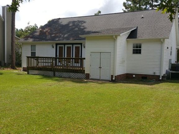 Recently updated and freshly painted! Classic, Southern style, 3 bedroom, 2 bathroom, low country home will impress you as you enter! This open and expansive floor plan offers one level living, vaulted ceilings, large kitchen complete with granite countertops, white cabinets and brushed nickel hardware. There is no carpet in this home and it provides wide plank laminate wood floors all throughout the home including the bedrooms, with the exception of the bathrooms, which are tiled. The master suite has ample room, walk in closet, and a master bath complete with shower with dual showerheads. This gorgeous property has welcoming decks and porches for enjoying the outdoors in the shade. There is no HOA and a storage shed for all your toys and landscaping tools