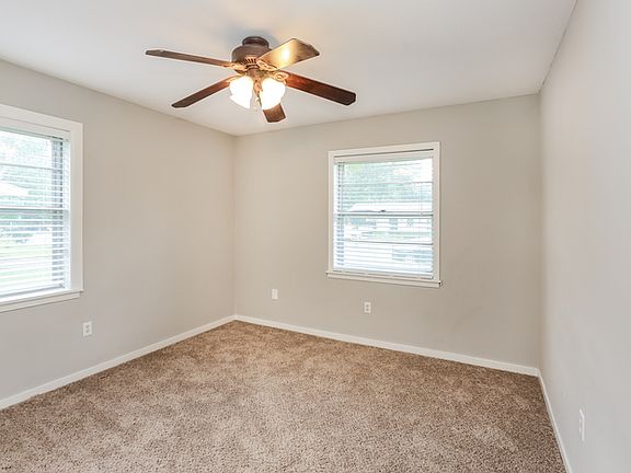 The bedroom wing is positioned away from the main living areas for added privacy. All three bedrooms are carpeted and include ceiling fans, while the primary bedroom benefits from direct access to the half bath. A full bathroom with a tub and shower combination serves the remaining bedrooms, maintaining a practical flow throughout the home.
