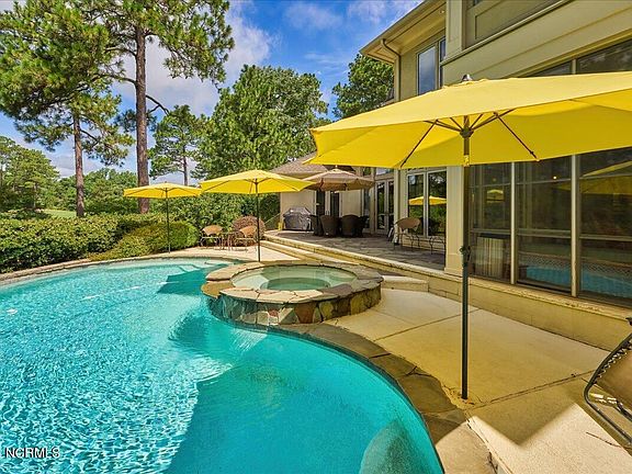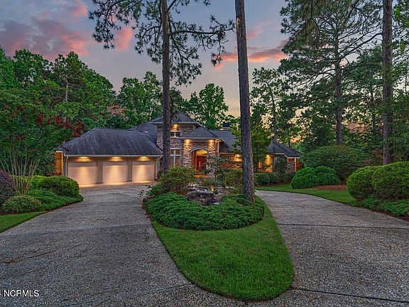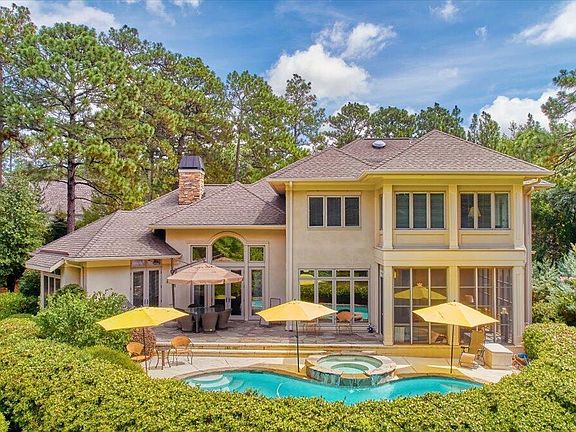 This Mediterranean/Tuscan style home was built in 2003 for the current owners by Bonville Construction Company. Located on almost an acre lot nestled between the 5th and 6th holes of the Jack Nicklaus Signature #9 golf course at Pinehurst Country Club (formerly National Golf Club), it features style and detail rarely seen in this area. Enter the property on an aggregate stone driveway surrounding the waterfall and rock feature in the front. The arch at the front opens to a 10' x 10'' porch which leads to the 11' x 9' foyer with the 12' barrel ceiling. Arches send you to the adjoining rooms including the dining room currently used as a sitting room and the 18' by 21' living room with its 17' vaulted ceiling. There is a stacked stone fireplace, built ins and a bar with a wine refrigerator in the living room. After looking up at the ceiling vaults and details, remember to look down at the beautiful Australian Cypress floors., then enjoy the views of the in-gound pool and privacy of the back yard. There are glimpses to be had of the 5th hole of the golf course here too, and if the next owner wants better views, some tree trimming would provide this for them. The kitchen is a cook or chef's dream. There is an island with a prep sink, gas stove and a separate wall oven (2 ovens total). There is plenty of counter space for any cooking project and storage that goes on and on. Practical and beautiful, the locally crafted lead glass in the cabinet doors in the kitchen and living room bar area are stunning. The breakfast area overlooks the pool as does the porch with EZ Breeze slides that converted this screened porch to a nearly year round use room. The primary bedroom offers views of the golf course from one side and the pool from the other. Built ins, two walk-in closets and a bathroom that is huge further enhance the area. There are separate vanities, a walk through shower and a bathtub that is the primary feature. Also on the main floor is another ensuite bedroom currently used as an office. The laundry room is also a craft room with ample storage for the creative craftsperson. The garage is a full three car garage. Upstairs you will find two more bedrooms, each with a walk-in closet and a Jack 'n Jill bathroom. There is also a Sunroom that could be used as a fifth bedroom, office/den or exercise room. There is walk in storage (13.7' x 15') with even more to each side. The home is located conveniently within 5 minutes of the Firsthealth hospital complex and within 10 minutes of the new physicians' offices on Morganton Road, and within 10 minutes of the main golf courses of the Pinehurst Country Club. Lots of grocery stores and shopping nearby in the Village of Pinehurst (5 minutes) and Southern Pines (10 minutes). The home has been beautifully maintained and enjoyed.