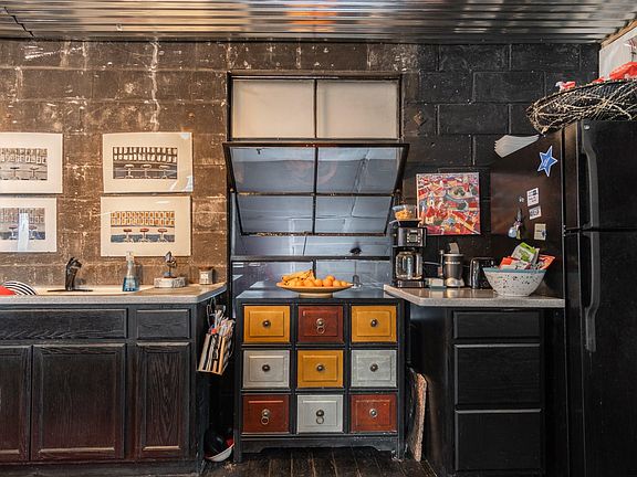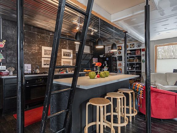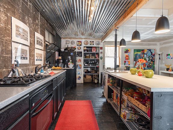 Artistic hideaway in Scotia. This unusual structure has been creatively reimaged into a fun cozy home with newer roof. Sitting on a very private lot tucked off Sunnyside Rd, you will be amazed at the inspiring adaptations that have been done. Open floor plan on first level with original structural boards as flooring; exposed grey concrete wall as backdrop in kitchen area; huge island tastefully recreated; large windows lets in lots of light. Lower level is another open family room area with 2 sets of sliders that open to a cleverly created expansive backyard that is totally fenced. Enjoy the peace and quiet in the sculpture garden as the farm land behind maintains the atmosphere of serenity. This funky little home is ready for a new owner to finish the cosmetic work, adding their own touch