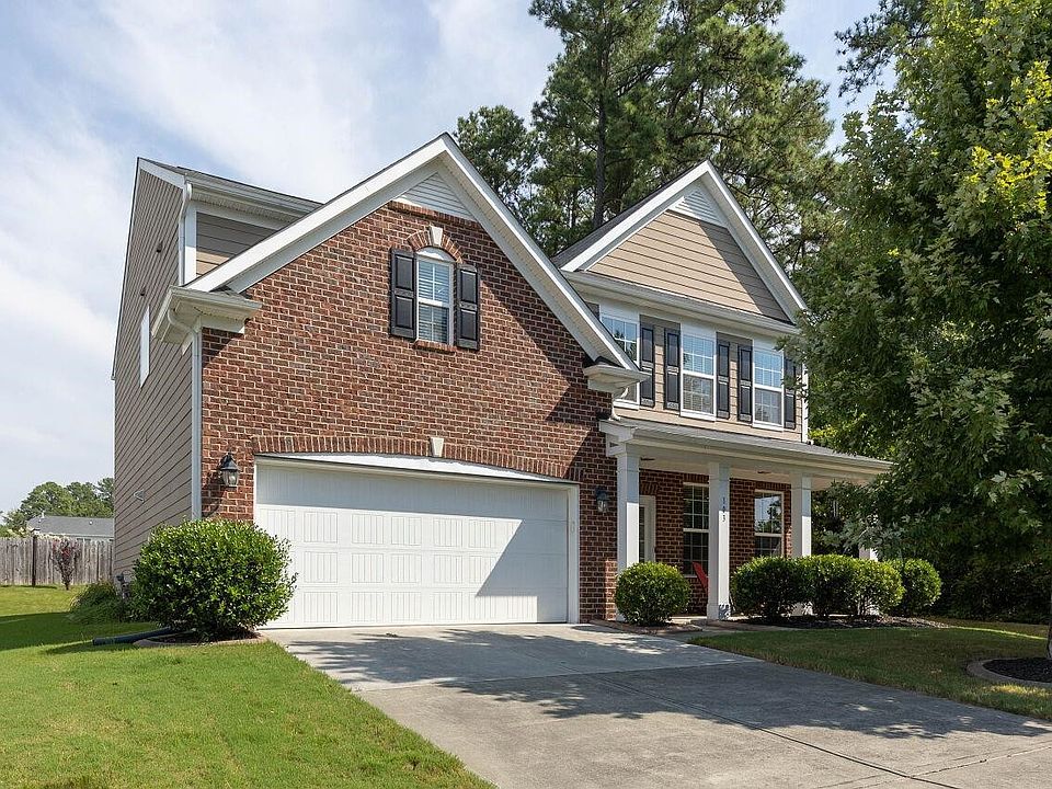 Here is a move-in ready gem with minimal wear, a spacious layout and a master closet of your dreams. This two-story transitional home has a large kitchen open to breakfast & family room. A formal dining & living room round out the main level. You will find three bedrooms, bonus room and laundry upstairs. The back patio overlooks a private tree-lined yard, and the covered front porch is perfect for a lazy afternoon. The neighborhood amenities include pool, tennis, pickleball and a playground. Superb location close to Duke, RTP, RDU Airport, Umstead Park and easy drive to Brier Creek Shopping and new Publix grocery. Freshly painted exterior 1 year ago; new hardwood-look laminate floors 2 years ago. Roof and HVAC are original; recently serviced and working well. Low maintenance brick and fiber cement siding.