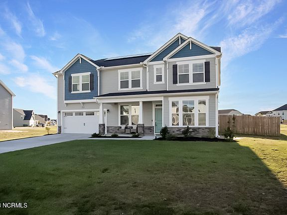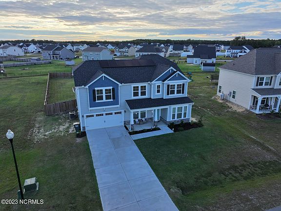A job move brings you upgrades galore on a one year old spacious home with almost no utility bills due to deluxe solar panels at no cost to you! 100 extras! Gourmet kitchen, upgraded hood and double wall ovens, water softener system, fenced yard, tile in baths, screened porch, wood custom shelving in pantry and closet. Coffered ceiling in the dining. Every single detail has been thought out as 2 years were spent in the presale planning and build of this special home. Inspected every step of the way, Even pre-wired for surround sound and internet. Pool community. Easy access to Raleigh, Wilson, and SJAFB.