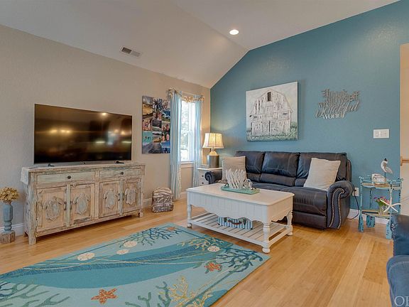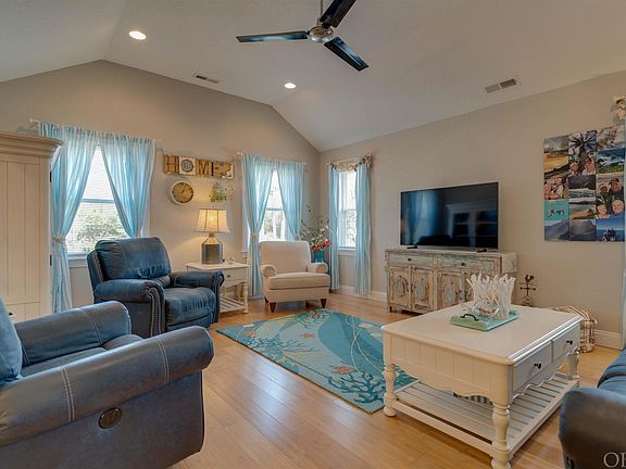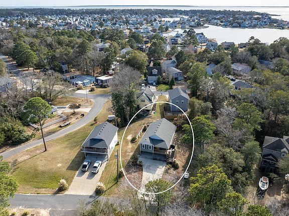 We have an Absolutely Adorable Classic Coastal Cottage here!  Built by one of our OBX finest, Scottie Leavel in 2016, this home is tucked away on 8,500' lot a quiet dead-end street in the gated waterfront community of Colington Harbor.  At 1,700’ this 3-bedroom, 2 full bath home has been loved and well maintained.   The design of the open floor plan was well thought out as it provides a very comfortable flow and plenty of sunshine coming in. Spacious living room with hardwood floors and vaulted ceilings.  Dining room and upgraded kitchen with all stainless-steel appliances, soft close custom cabinets, granite countertops, the popular farm sink that everyone wishes they had, under counter lighting, and ceramic tile floors.  Island with seating for 3.  Wide hallway with an expansive pantry leads to three nice size bedrooms and hall bath.  Primary bedroom has a large walk-in closet, sliding glass doors leading to a deck overlooking the backyard and a private bathroom with double sinks and Silestone countertops.  Ground floor has a dry entry, laundry room & large storage room.  Also, additional storage under the stairway.  You will just love the amount of closet & storage space the home provides. Attic. Covered Deck. Expansive carport easily fits three cars with plenty of room left over for entertaining out of the sun!   I just love this house and know you will too!  If you are not familiar with Colington Harbor you will also fall in love with everything the community has to offer.  A gated community, soundfront pool, soundfront beach, tennis courts, playground, clubhouse, boat ramp, marina.