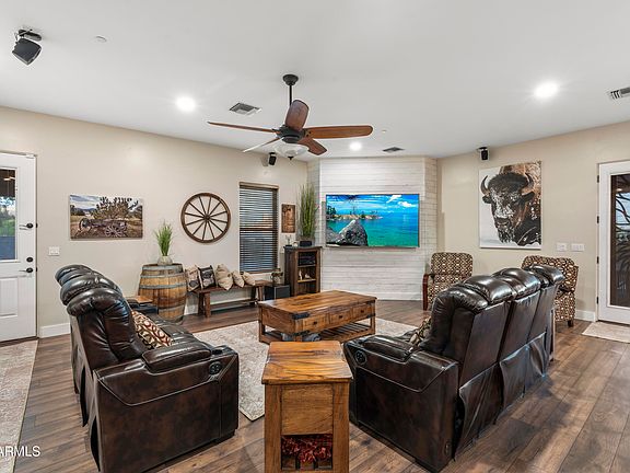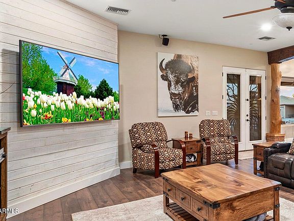 Very few homes check every box! A single-level ranch with a pool, an oversized garage, and situated on 1.25 acres of usable land with horse privileges! This home immediately feels like a newer-built, custom home as soon as you arrive. Handmade iron gates and security doors, solid alder interior doors, soaring flat ceilings, and 3.5 baths complement the design. Outside, you'll find 1,500 square feet of covered patio space and 4,000 square feet of travertine surrounding the pool. The exceptionally designed split floorplan features a primary wing, with three additional bedrooms separated by a GIANT open-concept great room. Over $150,000 in upgrades have been completed in the last two years, including new flooring, paint, bathrooms, high-efficiency windows, HVAC, and updated electrical, featuring a 50-amp run for the spa and a 30-amp hookup for an RV.