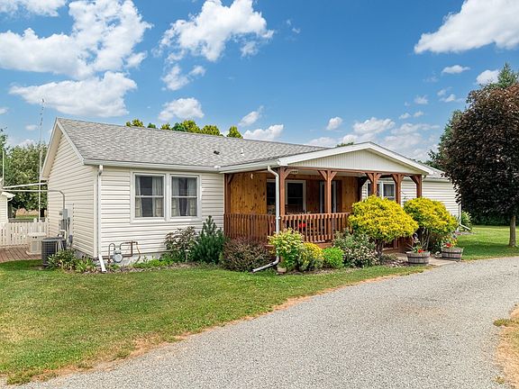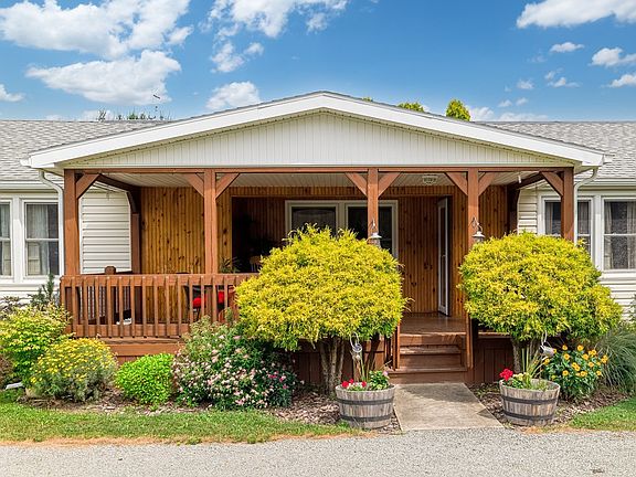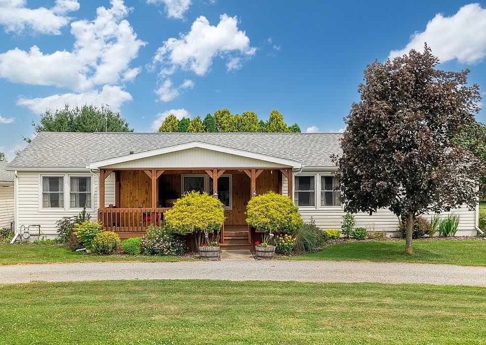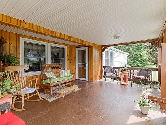 Meticulously cared for home featuring a nice kitchen area with a breakfast bar, open to a beautiful living room with a gas stove & doors to covered patio. Spacious master bedroom suite with a walk-in closet and french doors to bathroom. There is a nice dining area, two additional bedrooms with closets, additional full bath and first floor laundry. The heated, 2 car garage has a workshop area (some cupboard/shelving reserved for seller) & there is a new storage shed with an overhead door. Relax and take in the beautiful views that surround you from the large, covered porch or enjoy the private covered patio in the back of the home with a fenced yard area. This home is in pristine condition includes a generator, central air, window treatments & some handmade shelving (see document).