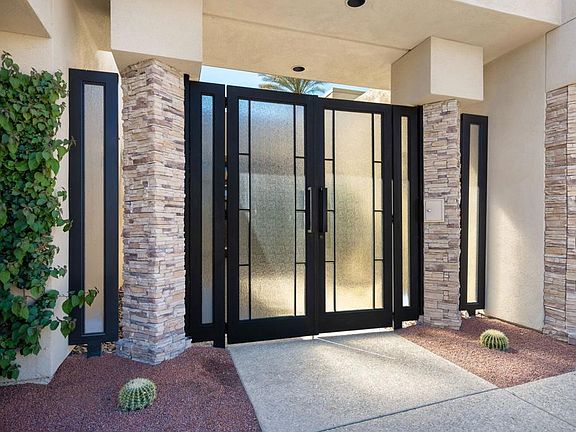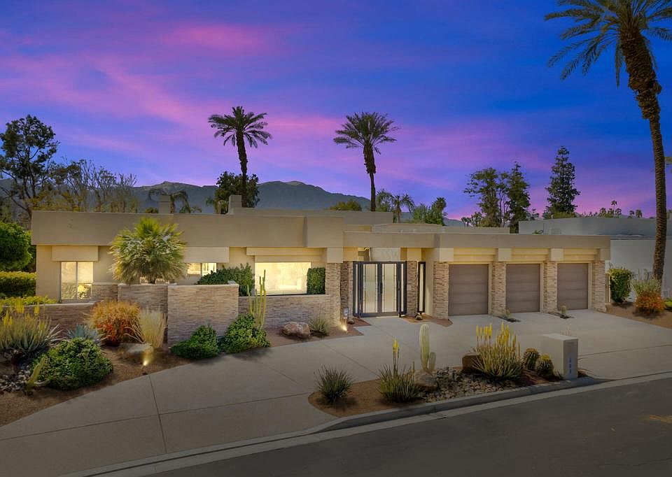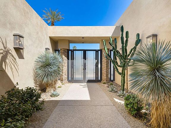 Incredible mountain views, coupled with total privacy and a perfect contemporary house. Primary bedroom has two bathrooms and a wonderful sitting room divided by a fireplace. 2 large walk in closets and a wet bar area with mini fridge leading to the bathrooms. Amazing large great room with sunken bar overlooking a beautiful and newly landscaped Desert friendly but lush back yard. Pool has totally undergone a redo in the past 2 years. The water feature dampens all exterior noise and makes the yard very zen and peaceful. Two en suite guest bedrooms and 4th en suite bedroom is used as an office, but has a full bathroom and closet. Perfect large kitchen with loads of storage and in impeccable condition. Family room off kitchen overlooks the pool and barbeque area. These homeowners have never had kids or pets living in the house. The home is in pristine condition. The roof was replaced 3 years ago. Then lets discuss location - across the road from Morningside CC and a golf cart ride to Tamarisk CC and Mission Hills CC.