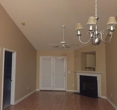 • Living Room: Fireplace, Floors-Laminate, Ceilings-High (over 9 Ft), Ceiling Fan