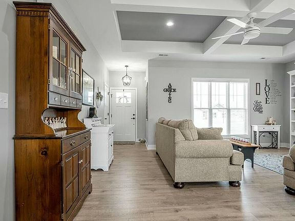 Don't miss this stunning 2-year-old ranch home on a quiet cul-de-sac with a level, fenced lot! Inside, 9' ceilings and an open floorplan impress. The entry flows into a family room with a brick electric fireplace and blower, perfect for cozy nights. It opens to a chef's kitchen with a large island, white shaker cabinets, granite counters, and all appliances included. The dining area connects it all, with gleaming laminate floors and a coffered ceiling adding style. Enjoy a separate laundry and drop zone off the garage. The primary bedroom features a board-and-batten wall, walk-in closet, and luxe ensuite with a tiled shower, glass door, and double vanity. Guests love the chic bathroom with a whirlpool tub/shower. The insulated, heated/cooled extended garage fits a workbench, and a covered patio overlooks the private backyard—ideal for relaxing. Move-in ready, this gem won't last—see it now!