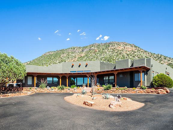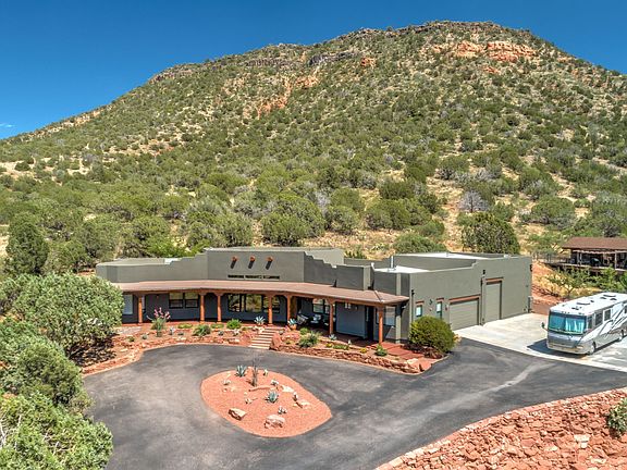 Immaculate, custom, 4 bdrm., 3 1/2 bath home on 1.93 acres backing to National Forest, with VIEWS of Sedona Golf Resort, Castle Rock, Bell Rock and more. This home shows tremendous pride of ownership and is move-in ready. Parking for RV with onsite pump out, horse facilities with riding arena, covered stalls, wash rack, hay barn/tack room. Very private but close to town for shopping, golf, restaurants, ice cream, gyms, hiking/biking, etc. Home shows tremendous pride of ownership. Office with built ins, drafting table, Media Room, lots of indoor and outdoor entertaining space, Custom Juniper on mantel piece and art niche, with mossy rock fireplace in great room, Mombassa granite w rough edge in commercial grade kitchen. Huge 1600 + sq. ft. garage/shop with RV door.