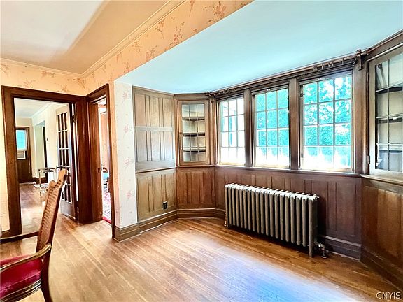 Wonderful opportunity in the desirable Berkeley Park neighborhood of Syracuse and on the doorstep of Syracuse University! 103 Windsor Place is like a time capsule with mostly original, gorgeous details throughout- wood floors, lovely paneling and trim, doors with brass and glass knobs, and more. The first floor has grand living and dining spaces, a very yellow kitchen with old fashioned cupboards and a lot of potential, an office facing the street, a beautiful enclosed porch overlooking the yard, and lots of built-in storage and character. Upstairs are 3 bedrooms, including a primary bed-bath suite. The primary has multiple closets and the attached bath has one of the most unique original floors I've ever seen. The walk-up attic and the basement are huge bonuses spaces. The yard is private with mature trees, there's a detached one-car garage, too. This house is just waiting to be scooped up and brought back to it's former glory! It's a gem! *Offer deadline of Sunday 7/7 at 5:00pm*