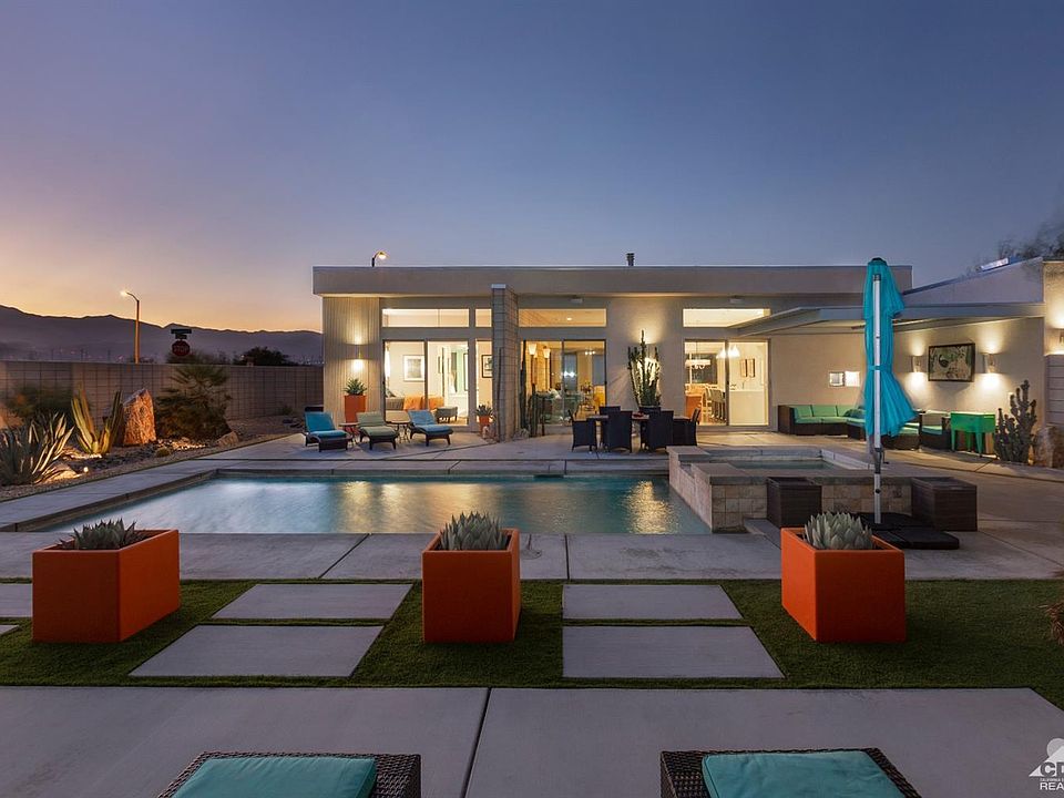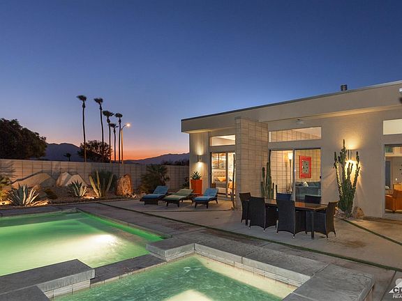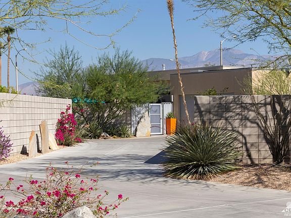 This 2014 James Cioffi designed modern home with OWNED SOLAR was featured in a home tour during the 2017 Modernism Week's Fall Preview. Ceiling heights up to 11.5 Ft and clerestory windows fill the home with natural light while the vintage-style block wall anchors the home and helps to direct the attention to the commanding San Jacinto Mountains. The Great Room features polished concrete floors, spacious conversation area with Fireplace & pre-wired for surround sound, Dining and Kitchen featuring stainless appliances, upgraded backsplash & quartz counters with a trapezoidal kitchen island all enjoying direct access to both front and rear private yards, the Pool/Spa, upgraded & lighted desert landscape, covered patios and amazing mountain views!The Master Suite features a large sitting area, direct access to the pool/spa, mountain views, walk-in closet, dual vanities, soaking tub and oversized shower with bench. An attached casita with private entrance & bath generates income.