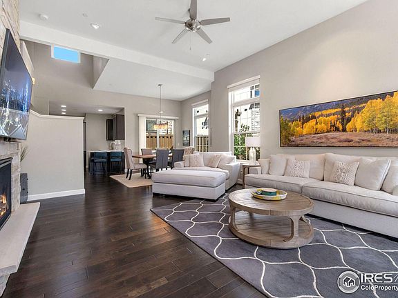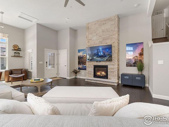 Welcome home to maintenance free living in the foothills of northern Colorado that is walking distance to trails and open space. This end unit was a former model home and has all the upgrades and appointments including: 2 primary on-suites, 9 foot windows on the main floor, high ceilings, gas fireplace wrapped in custom stone, quartz countertops, custom cabinets, gourmet gas stove, fully finished basement, passive radon system, on-demand hot water heater. Other features include private primary suite on 2nd level w/walk-in closet & full bath, 2nd primary suite on main level w/walk-in closet and full bath, 1/2 bath on main level, gorgeous kitchen, large main floor living and dining room, fully finished basement with 2 additional bedrooms, full bath, large recreation room, big storage area, private patio, 2 car attached garage, this is a lovely open flowing floor plan.