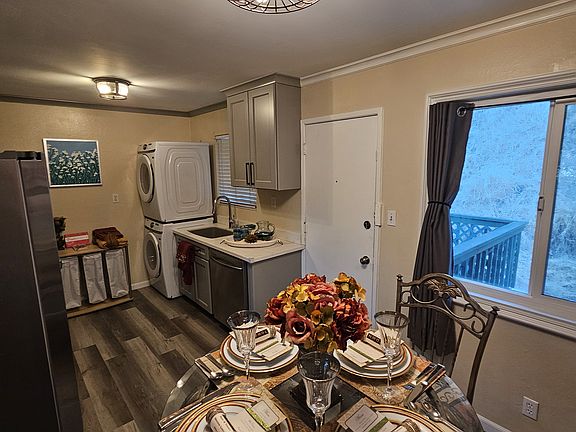 STAINLESS appliances including dishwasher, refrigerator, microwave, in-house washer, and dryer.