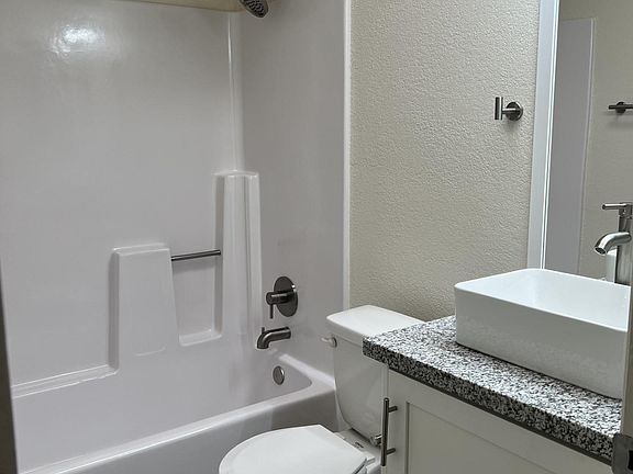 Gooseneck faucet, quartz kitchen countertops, stainless steel appliances, upgraded cabinets, full size washer and dryer, stained concrete floors, linen closet, broom closet, enclosed backyard.
