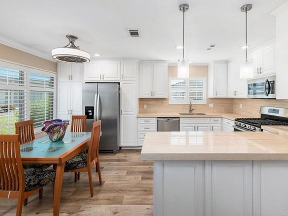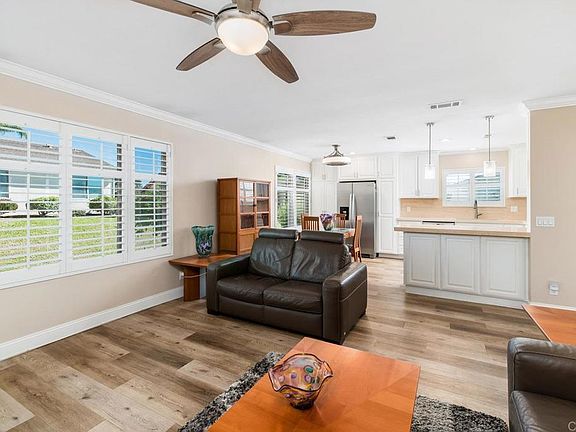 This highly upgraded single-story is located in the sought-after 55+ Oceana III community. The entire home has been remodeled, including a stunning makeover of the kitchen and bathrooms. The upgrades extend to the functional aspects of the home as well, with new windows, a new heating and air system, new water heater, and repiping of all plumbing (See upgrade list in MLS Docs). The kitchen is a beautiful highlight of the home, featuring stone counters, custom cabinetry and brand new stainless steel appliances including the stove and microwave. The spa-like master bath features double sinks and an oversized walk-in tiled shower. The attention to detail continues with the addition of vinyl wood floors, crown molding and plantation shutters throughout, adding a touch of elegance. This end unit is conveniently low maintenance, with the landscaping being taken care of by the HOA, and offers a 1 car garage and covered carport. Oceana is a popular community that boasts great amenities, making it the perfect place to enjoy an active retirement lifestyle. If you're looking for a turnkey home in a great community, this is the one!
