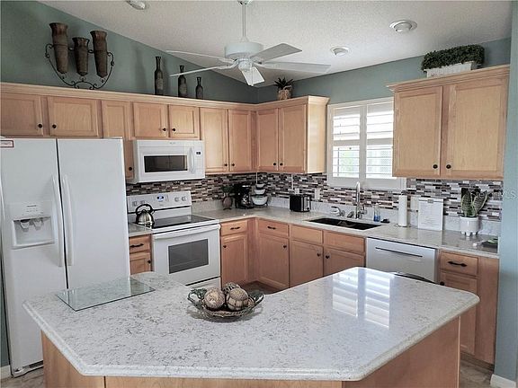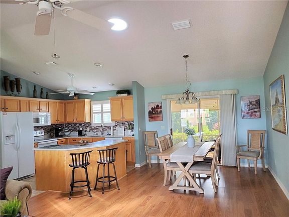 Great location near Sumter Landing! BOND IS PAID>>>Amarillo with plenty of upgrades. 3 bedroom, 2 bath split bedroom plan with volume ceilings. Open floor plan. Master bedroom with large walk in closet and master bath with dual vanities. Kitchen includes quartz counter tops and new appliances, including Bosch dishwasher. Cabinets with pullout drawers and breakfast bar. Plantation shutters throughout, solar tubes for natural lighting, additional closet storage and new ceiling fans. Aprilaire system on AC--removes airborne particles including dust, pollen, mold spores, bacteria, pet dander, and dust mites. Updated landscaping, enclosed lanai with AC. New motorized garage screen. Low maintenance landscaping with curbing, painted drive- and walk-way, front porch with fan. Gutters to maintain rain flow. The Village of Sabal Chase in the heart of The Villages and so many recreational activities all around! So close to three rec centers and Mallory Hill CC with golf all around in an unbeatable location between Lake Sumter Landing and Brownwood Paddock Square. Furnishings negotiable.