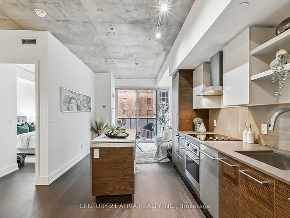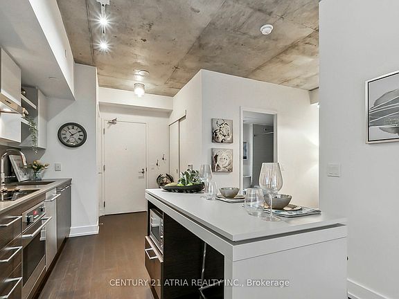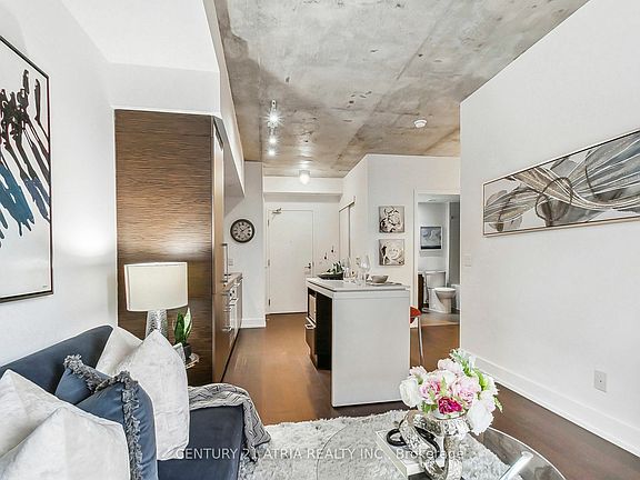 Beautiful, modern 1+1 Suite in the heart of King West! Features: Eng Hardwood floors throughout,9Ftconcrete & smooth ceilings, good size bedroom, modern kitchen W/European integrated appliances &separate breakfast island, caesar stone countertop, ensuite washer/dryer, Brand new floors, Newly painted. Custom Blinds by Mera,LARGE balcony & floor to ceiling windows. Amazing location & amenities W/24 hr concierge. Groundfloor supermarket, dining, cafes, liberty village & more all walking distance! Walk Score 90,Transit Score 91!