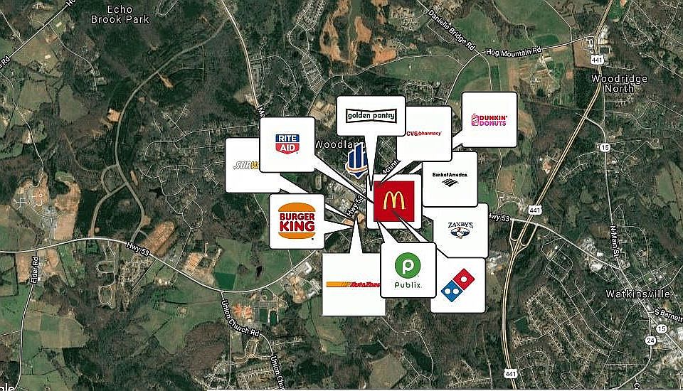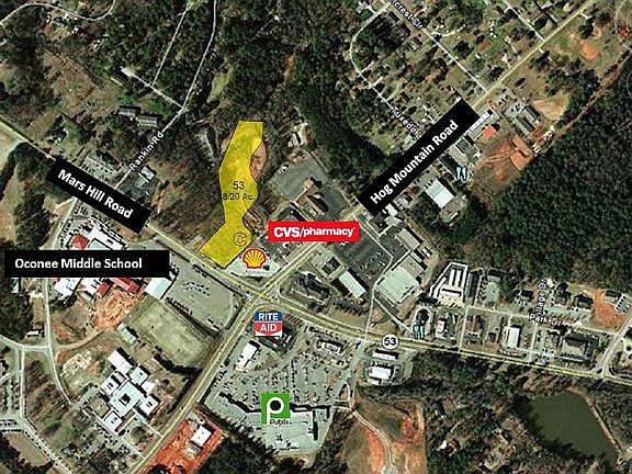 Agents protected. This 8.18+/- acre development site is in the commercial corner of the long established Butler's Crossing Intersection with over 53,000 vehicles per day influence. Strong nationally branded businesses are on every corner as well as many regional and local businesses. This parcel is in the shadow of the Publix anchored shopping center. Utilities available. Oconee County is home to the #1 ranked school district in the State of Georgia per SchoolDigger and ranked in the top 2% nationally per U.S. News and World Report. Neighboring Athens, GA home of the University of Georgia. Prime location for restaurant, retail center, neighborhood center, office complex, etc. Front 2.71 +/- acres is zoned B-1 - Back 5.47 +/- acres zone Office-Business-Professional (OBP). Commercial curb cut in place on Mars Hill Road. INVESTMENT HIGHLIGHTS Incredible opportunity. One of the few vacant lots left at intersection of GA Hwy 53/Mars Hill Road. Major intersection with corner influence. 53k VPD