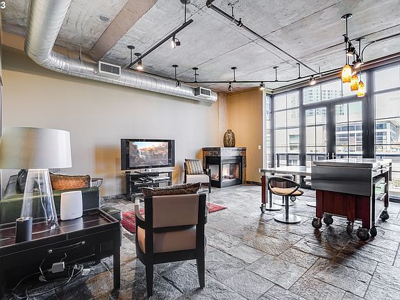 Stunning Penthouse loft in the Pearl District with deeded parking. Views of the Fremont Bridge, local parks and city. Open concept living with high ceilings, gas fireplace, custom island/dining table, updated bathrooms with soaking tub and walk-in shower, large primary suite with vaulted ceiling and 18' wall of windows, plus 2 exterior balconies with fabulous views. Option to purchase fully furnished and additional deeded parking space. Tons of storage with additional storage on the garage level. Amenities include 2 story gym, community rooftop garden, and well-appointed community room for entertaining. A rare find in the heart of The Pearl with all the conveniences of shopping, dining, and transportation. Call today for more info!!
