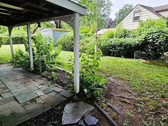 This large corner lot is partially obscured offering privacy in the back yard to enjoy the covered patio, koi pond, and flowering perennials. There is a metal garden shed for storage. Tinker under the hood in the 200sf single car garage or convert the space to better suit your needs