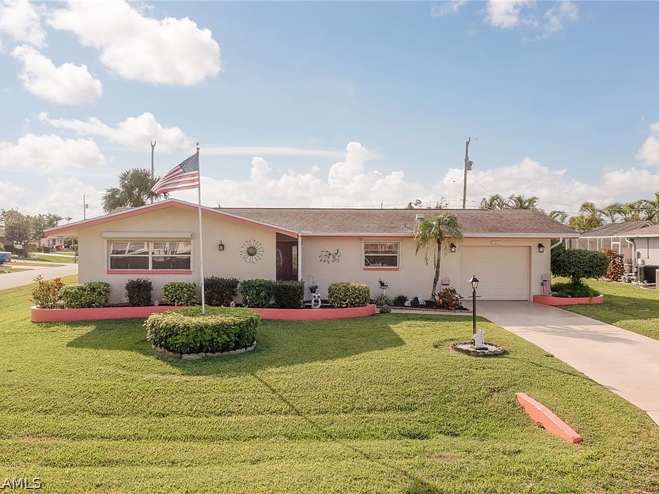 Welcome home to this charming 1,658 sq ft corner lot home in SE Cape Coral. The split floor plan has 3 bedrooms, 2 baths and a large enclosed lanai off of the living room filled with sunlight. Enjoy dining at the breakfast bar or open living/dining room with additional refrigerator and removable storage. Brand new AC in 2022. New lanai roof 2022. The home is armed with a generator link to power the entire house, and has user-friendly hurricane shutters for all windows. Water filtration system 2013. Prior to November 2022 this home was not in a flood zone, but owners do have a flood policy ($689 annual). Plenty of room for an extended patio and in-ground pool. Close to downtown Cape Coral restaurants, bars and churches. This home is move-in ready. Schedule your showing today!