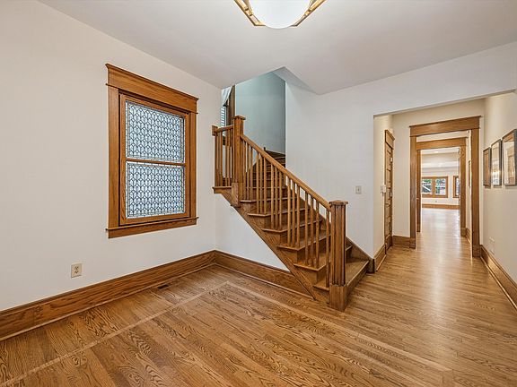 Welcome to The Francis J. Woolley House built in 1893. This Frank Lloyd Wright transitional masterpiece is spacious, restored and updated. Enjoy the unique and special neighborhood with views of other historic homes from your restored front porch (2025). The large foyer opens to the double living room with working fireplace (new liner 2019). A unique light fixture in the dining room highlights the space. Newer custom kitchen (2018) is a cooks delight! Miles of counter space and a huge island allows for everyone to join in meal prep or just relax and chat. Kitchen opens to the family room with beautiful art glass and both have a panoramic view of the multi-tiered deck w/hot tub (2019) and landscaped backyard. 1st floor 1/2 bath with W/D closet redone in (2020). Take the double staircase to the 2nd floor which offers 4 large bedrooms including the primary with its zen-like en suite bath and walk-in closet with custom shelving. 3 additional bedrooms share a large hall bath and all bedrooms have ample closet space. The 3rd floor is a treat, with 3 large rooms which could be additional bedrooms, perfect for guests. However, sellers used it as 2 offices and a guest BR. Basement (perma seal 2018) and new carpet is a great REC room with 1/2 bath, wine room, utility and plenty of additional storage. 2 car garage in fenced in backyard, brick pavers recently power washed. This house has been lovingly cared for and updated over the years. Many, but not all, windows have been replaced, newer floors and bathrooms too. 2 zone HVAC. Fresh neutral decor 2025, floor refinished on 1st floor 2025. Foundation and chimney tuck pointed 2025. This sun filled house has it all, history, architectural pedigree, in-town location and a very open feel throughout. Don't miss this opportunity to own a Wright in the heart of the Frank Lloyd Wright Prairie School of Architecture Historic District and in a walk to everything location! Steam shower, heated floors in primary and outdoor yard sprinkler are as-is.